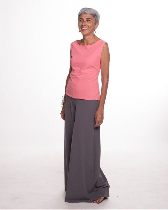 Scollatura ampia e morbida che scivola sul décolleté con movimento naturale. Top senza maniche collo ad anello, scollatura profonda sul dietro.